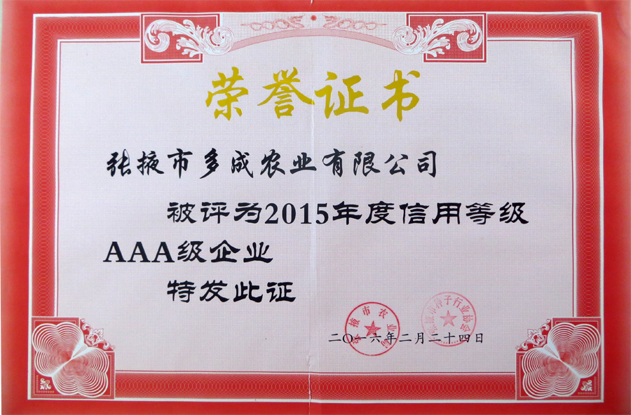 熱烈祝賀張掖市多成農(nóng)業(yè)榮獲2015年度信用等級AAA企業(yè)稱號(hào) (2016-02-26)